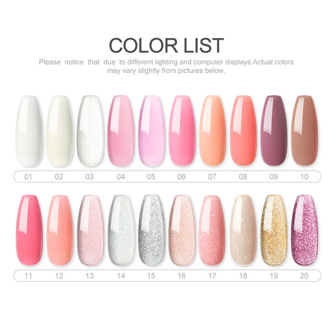 Colors: A total of 20 colors, divided into pearlescent color and crystal color. There are 8 types of pearlescent colors and 12 types of crystal colors. The grand variety of colors bring you a big choice, they can meet all your needs for a great nail art.