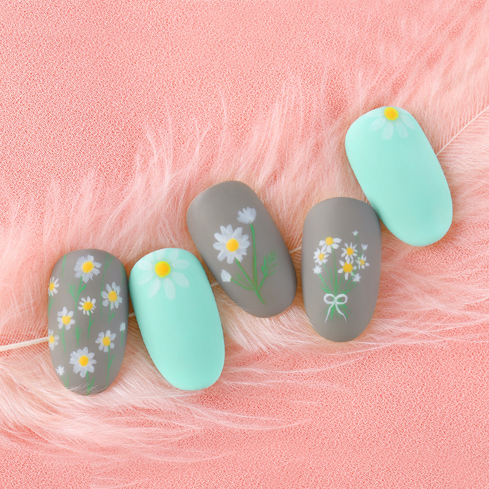 In summer, there is another color that must not be missed---green. Whenever you see green, you seem to lose a little bit agitated. The clever combination of gray and tender green has completely created the coolness and simplicity that summer needs most. The matte texture and the simple graffiti of small daisies are simply cute.